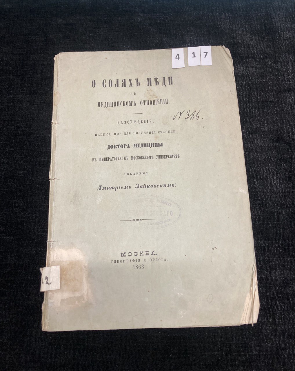 О солях меди в медицинском отношении. Д.Зайковский. Москва 1863 г. (4.17)