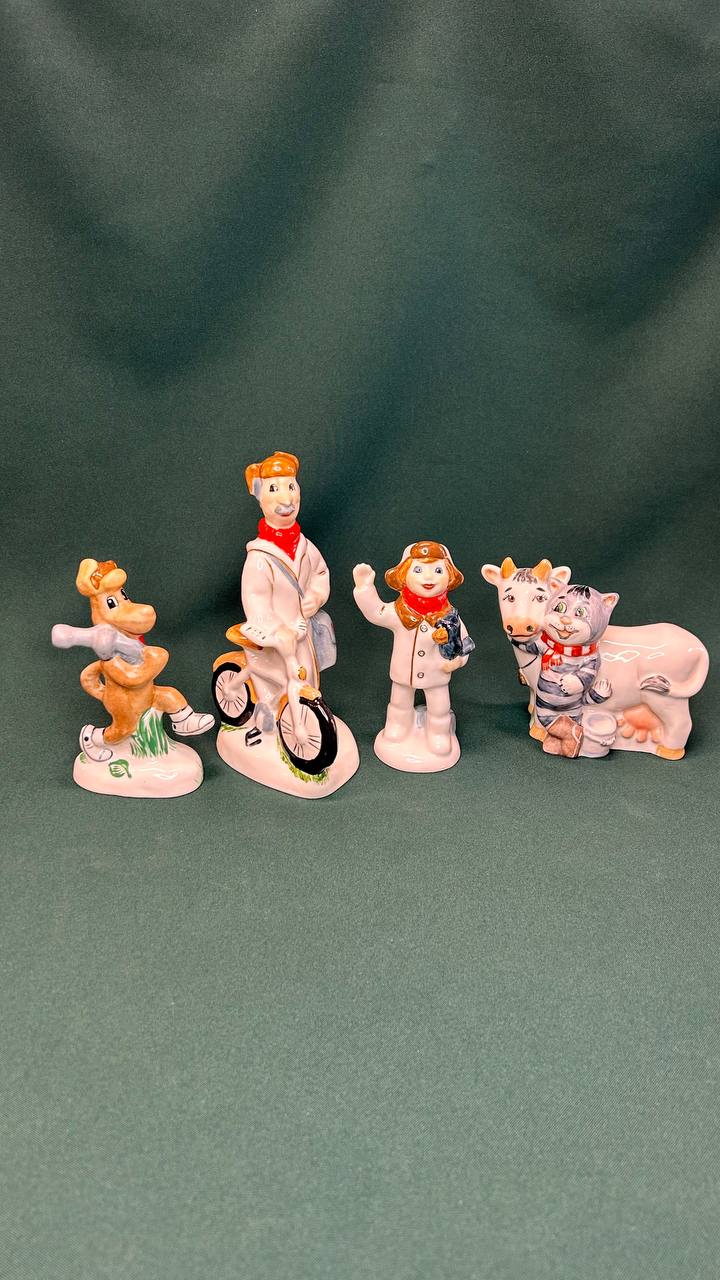 Композиция "Простоквашино", СССР 1980-е гг (2.393) фарфор, роспись, высота; Печкин 17 см, Матроскин с Муркой 11 см, Дядя Федор 13 см, Шарик 13 См. Клеймо Завод Коростень