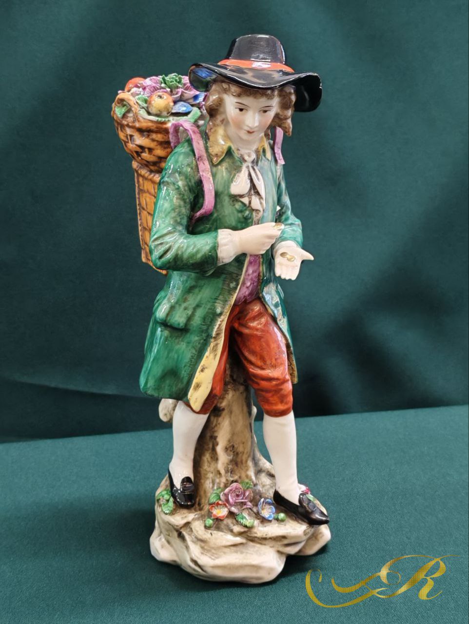 Статуэтка "Еврейский мальчик с цветами", Германия, 1900-е г. 25 см. Фарфоровый завод Sitzendorf, Германия. Клеймо с короной и буквой "S" на дне статуэтки свидетельствует о том, что она была изготовлена в период с 1902 по 1918-ый год. Фигурки фарфорового завода Зитцендольф ценятся за высокое качество фарфора, изящную красоту, мастерство исполнения и историческую ценность. Особенно ценятся изделия довоенного периода, к ним относится и представленная статуэтка. Статуэтки данного периода изготавливались в крайне ограниченном тираже, что делает их уникальными предметами с высокой коллекционной ценностью. (2.122)