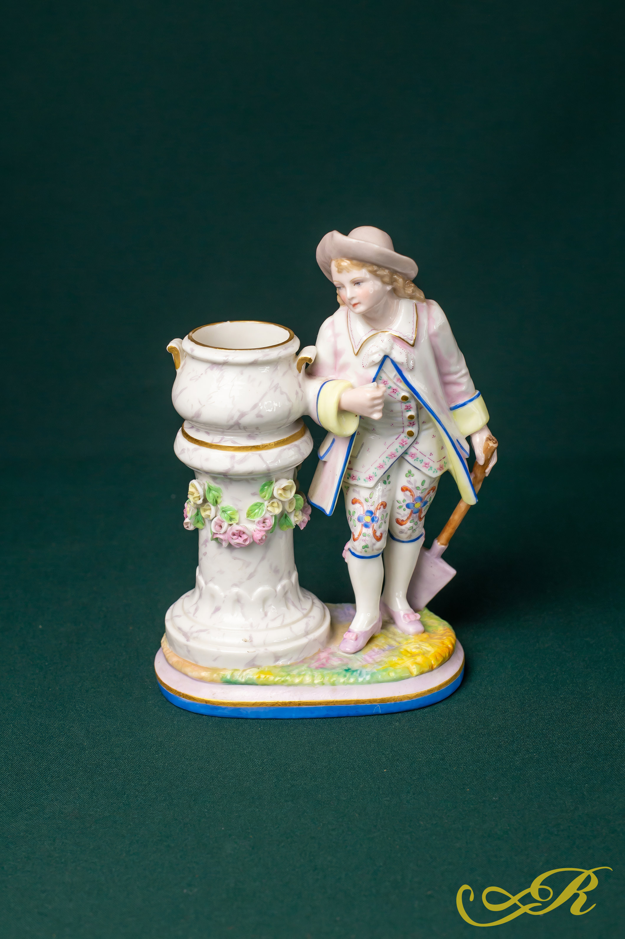 Материал: фарфор, роспись, золочение. Высота 19см. потертости позолоты. Скол цветка. Микро скол на ободке вазы. Реставрация ручки лопаты. Трещина на шляпе. Микро сколы на цветах.(2.279)