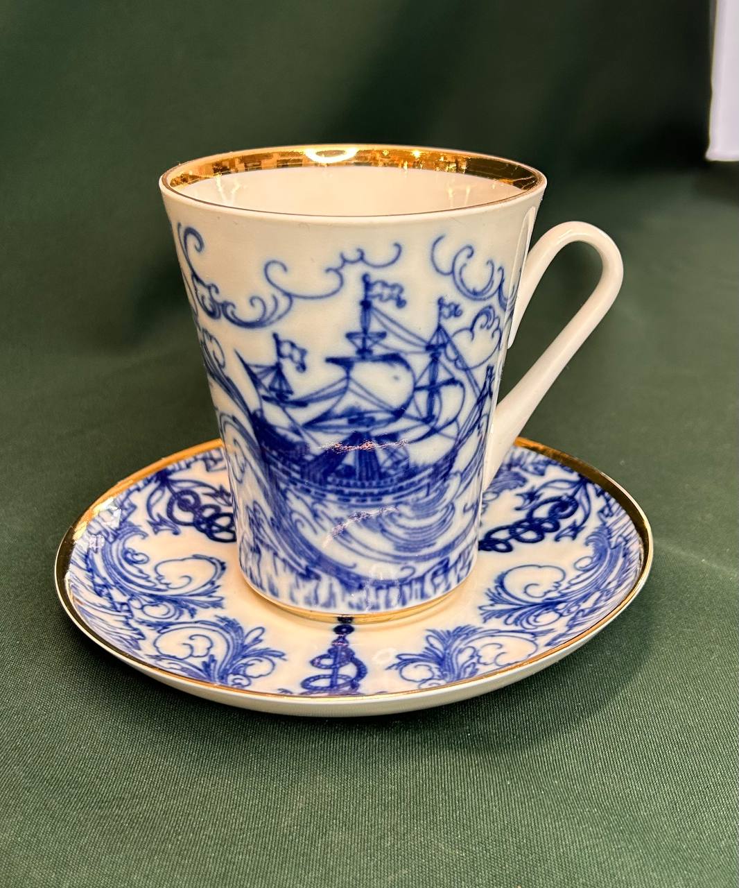 Чайная пара "По морям, по волнам", СССР ЛФЗ, форма бокала "Ленинградский", Клеймо: ЛФЗ, фарфор, золочение, высота 11 см. (2.394)