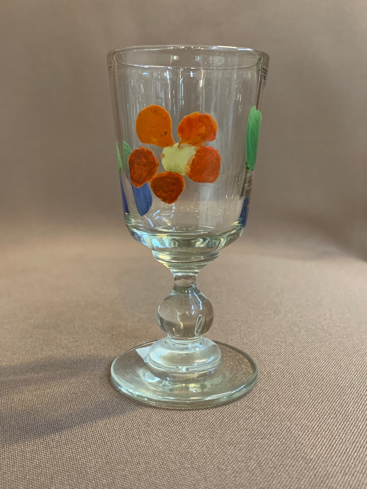 Рюмка (h - 89 мм, v - 40 мл). Произведена в России до 1917 года, точный производитель неизвестен. Сделана из гладкого стекла с применением шлифовки и имеет роспись эмалью.