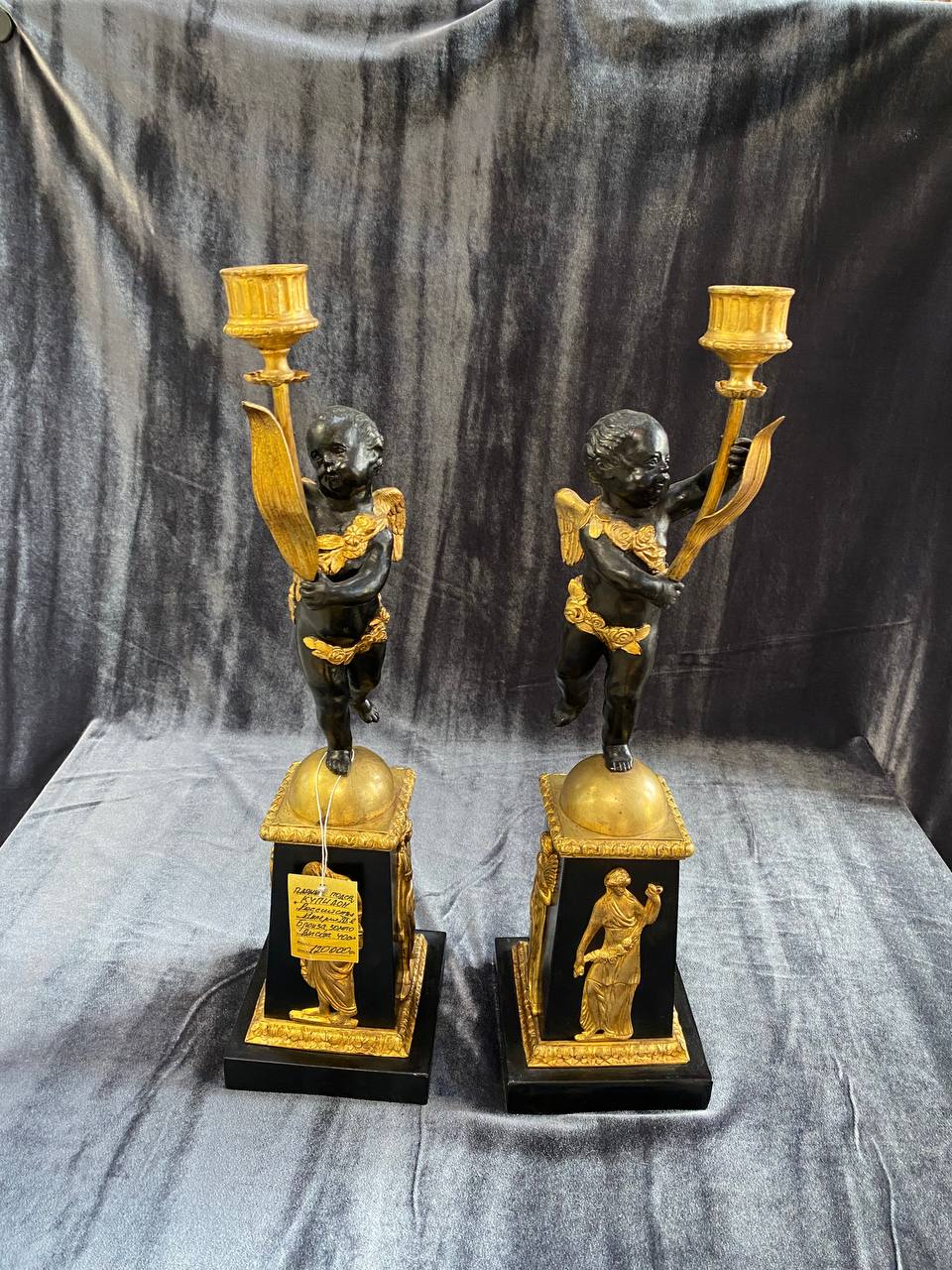 Подсвечники парные «Купидон» Российская империя XIX век, бронза, золото, высота 40 см,