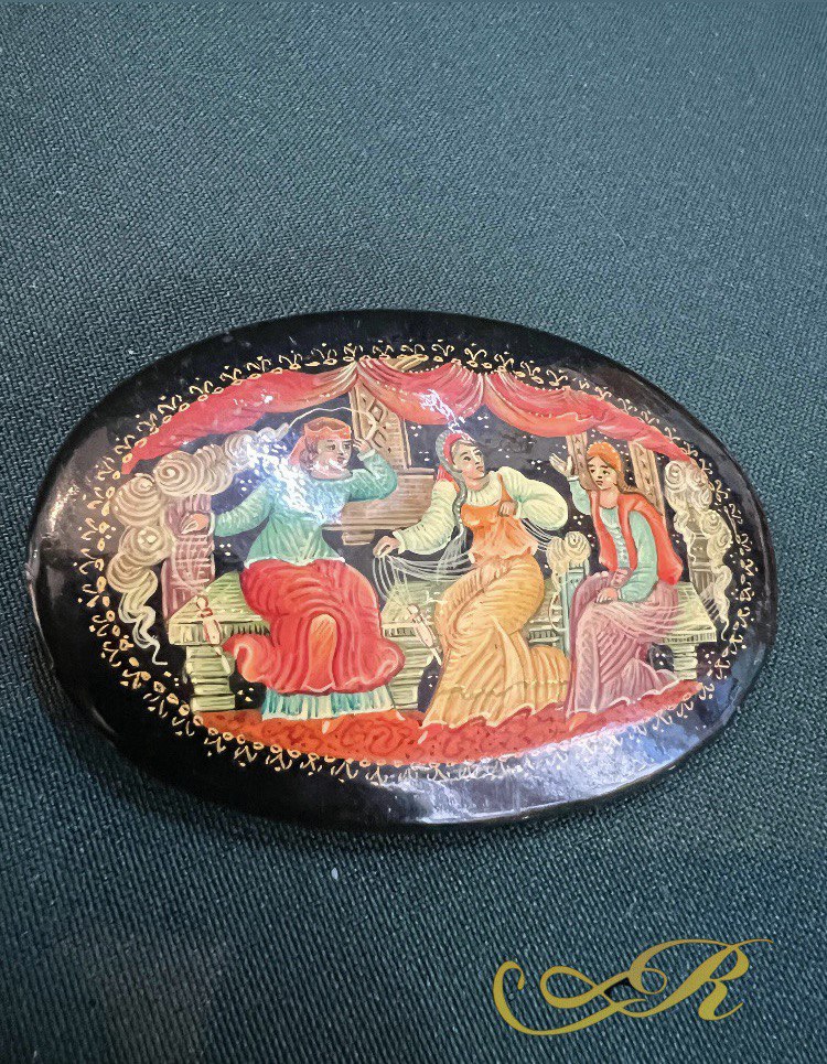 Брошка " Три девицы под окном …" папье маше. СССР.