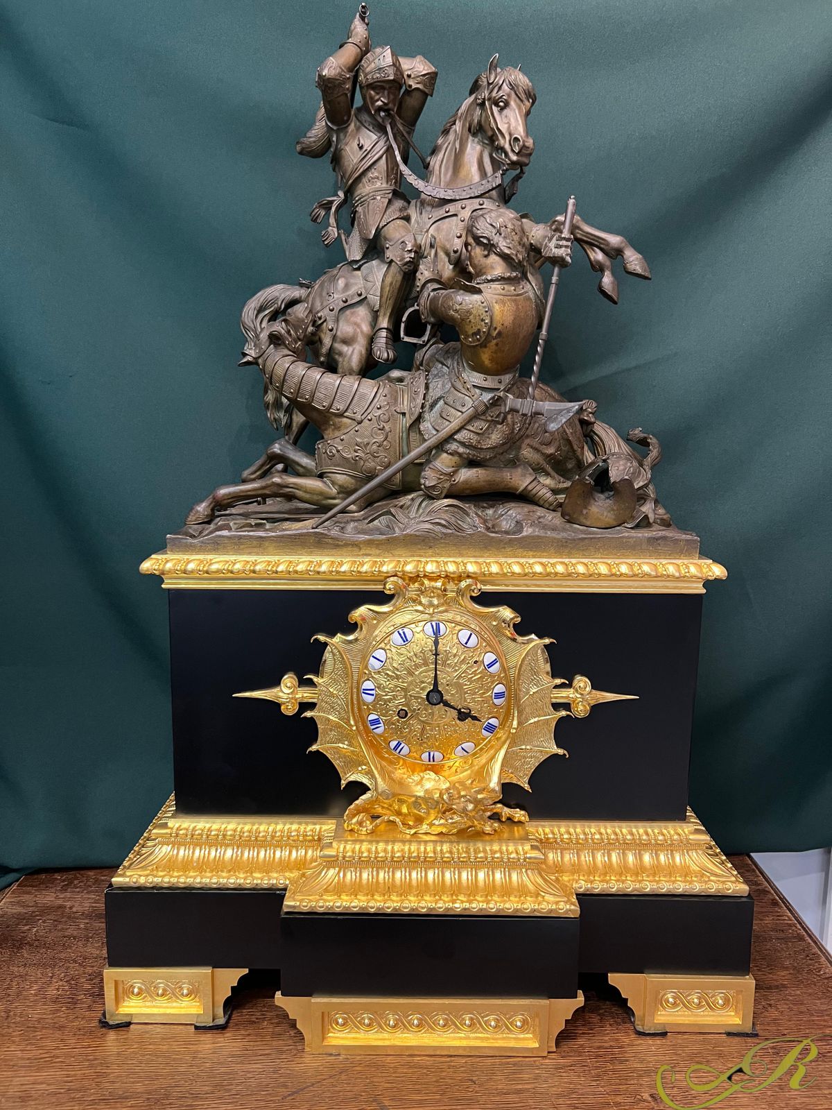 Парадные каминные часы фирмы Deniere Paris. Скульптурная композиция «Битва между Шарлем Мартелем и Абдерамом, королем Саррасена». Автор скульптуры: Т. Гехтер материал бронза. Основание - мрамор,золоченая бронза, эмаль для циферблата. Часовой механизм Швейцария.Каминные часы это выдающиеся образцы французского часового и декоративно-прикладного искусства конца XIX , символизирующие роскошь и стиль своей эпохи. Скульптурная композиция посвящена сражение при Туре (при Пуатье) 732 г. Фирма Denière à Paris: являлась поставщиком Императорского Двора Они создавали изделия для Наполеона I, Наполеона III и самых богатых и знатных семей Европы. Предложение по ценам рассматривается (9.86)