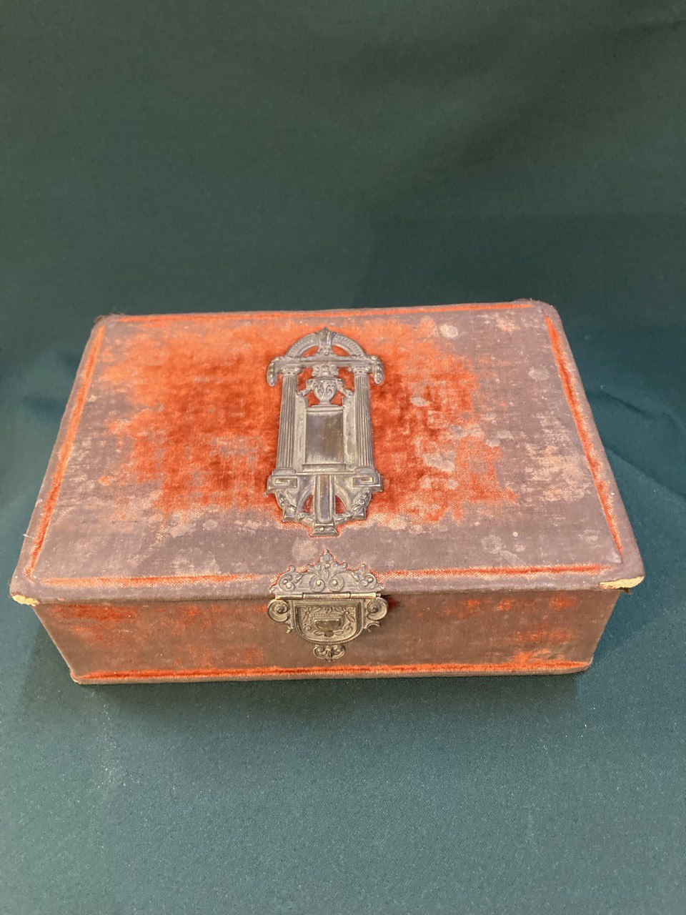 Шкатулка XIX в. Картон,бархат, медь с посеребрением, шелк.