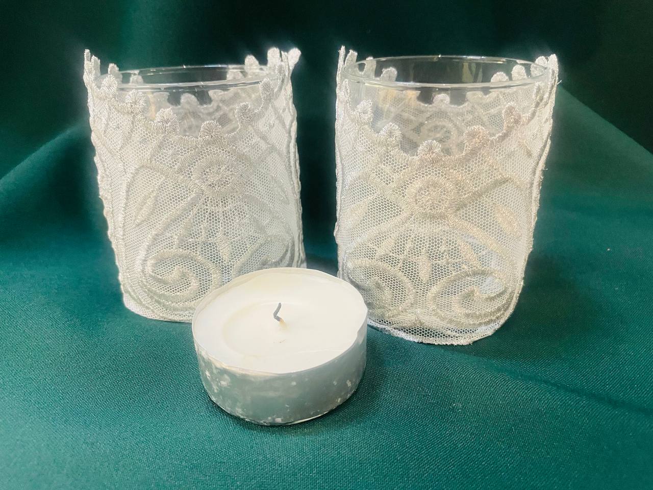 Подсвечники, набор 2 стакана. Огнеупорное стекло, серебряное кружево.
